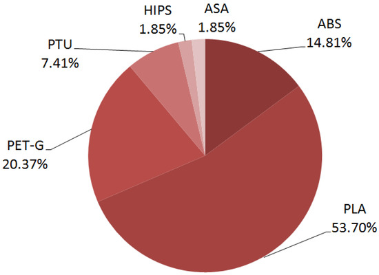 The most common filament used by the respondents is PLA. It was indicated by over a half of the respondents; see Figure 9. Other frequently used materials are PET-G—20% and ABS—over 14%.