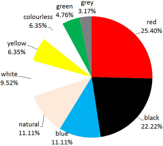 Transparent materials are the most neutral when it comes to the release of noxious fumes, but the respondents indicated that they very rarely printed in this colour—only around 6%; see Figure 10. The most commonly used colour in 3D printing is red, followed by black which is the most polluting and harmful due to its staining with soot.