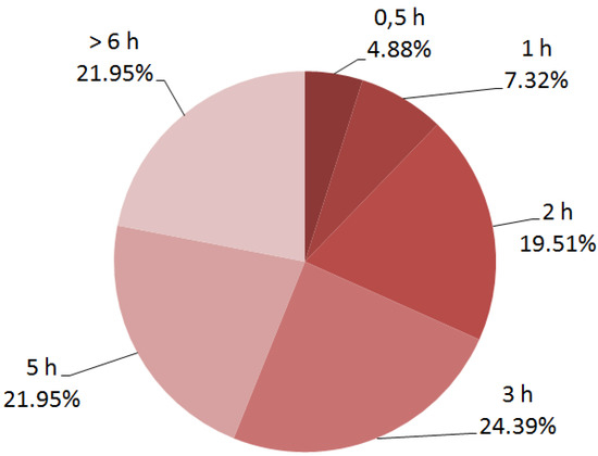 On average, it takes between two and six hours to produce objects by means of a 3D printer; see Figure 12. In total, 25% of the respondents said they printed for three hours, 20% of the respondents printed for five hours and 20% of the respondents printed for more than six hours. Given that the majority of the respondents have placed the printer in a room where they spend most of their time or sleep, this is not good for their health.