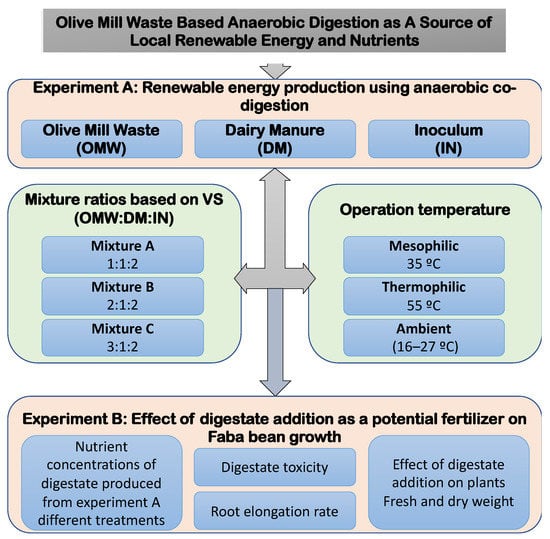 The agriculture-based AD reactor digestate is utilized as a fertilizer, with prior research investigating vegetable growth in hydroponic systems utilizing digestate as a growth medium [17,18,19]. Potassium (K), phosphorus (P), and nitrogen (N) are key plant nutrients [20,21]. The digestate contains sufficient concentrations of N, P, and K, and it could be used as a biofertilizer since they are easily available for plants [22]. Therefore, it could be used as a fertilizer to improve soil fertility and plant quality, and their immunity to biotic and abiotic agents [23]. Lošák et al. [24] in their studies conclude that the use of digestate improves the quality and yield of vegetables. The authors also reported that the use of digestate as a fertilizer increases the content of macro- and microelements in the soil and plants. In a study undertaken by Pivato et al. [25], they studied the potential emerging contaminants present in the digestate using ecotoxicological tests. They found that no significant negative effects have been observed on the plant growth, but rather that they improved plant growth and mineral content, which promotes the use of digestate as a biofertilizer in agriculture. The digestate is beneficial for the plants and, in addition, it also improves the structure of soil [26,27]. So, the possibility of using OMW as a fertilizer could be achieved when integrated and processed using AD. However, no other research had investigated the effects of employing digestate from a system that involves the co-digestion of OMW with dairy manure, as demonstrated in this study. Furthermore, co-digestion and thermophilic effects on energy production from OMW, as well as fertilizer quality, still need some investigation. The objectives of this study were (Figure 1): (1) assess the potential of using OMW in North Sinai and turning it into a renewable energy source; (2) to determine the quantity and quality of biogas produced from the co-digestion of different mixtures of OMW and dairy manure; (3) to investigate the impact of mesophilic (37 °C) and thermophilic (55 °C) conditions compared to uncontrolled temperatures on AD performance and biogas quantity and quality; and (4) to examine the impact of digestate on plant root elongation to investigate its importance after anaerobic digestion as a potential fertilizer.