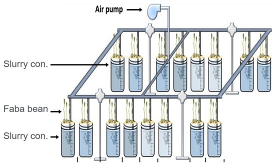 The experimental work was designed as described by Kopittke et al. [38], in a laboratory maintained at ca. 24 °C at Arish University, Egypt. Faba bean seeds (Vicia faba) were coated with rolls of paper towel and placed vertically under room temperature tap water for three days. Four seedlings were placed in 2 mm diameter holes in 10 mm-wide Perspex strips placed on the top of a plastic beaker (polyethylene terephthalate (PET)) filled with 275 mL solution of 1.0 mM CaCl2 and 5.0 mM H3BO3. The seedlings were grown for approximately 24 h in this basal solution before transferring the strips to different concentrations of digestate (0.0, 2.50, 5.0, 10.0 and 15.0%) for the exposure period (typically 24 h for toxicity measurements and 7 days for characterizing plant growth). Each concentration of tested digestate was conducted in triplicates, resulting in a total of 432 plants in the three digested slurries at the three digestion temperatures (mesophilic, thermophilic, and ambient) and 12 plants in the control (plant grown in basal solution only) (Figure 2).