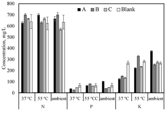 Nutrient concentrations (NPK, mg/L) of produced digestate under different temperature conditions (mesophilic, thermophilic, and ambient). Error bars represent the standard deviation of triplicates.