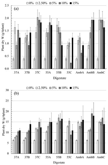 Dry (a) and fresh (b) weight (g) of the faba bean plant as affected by different concentrations (0, 2.5, 5, 10, and 15%) of digestate. Error bars represent the standard deviation of triplicates.