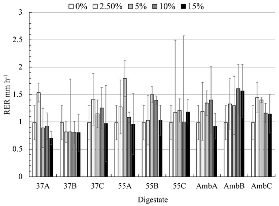 In an attempt to show the best concentration values for root elongation rate, Figure 6 shows a 5% addition of digestate—mixture A at 55 °C has the highest root elongation rate compared to other treatments. Generally speaking, the root elongation rates were increased until the concentration of 5%, then declined afterward with an exception in the case of mixture A and B at ambient temperatures. In comparison to mixture B at thermophilic AD, which gives 37% biogas production more than mixture A at thermophilic AD, the latest one is exceeded in RER.