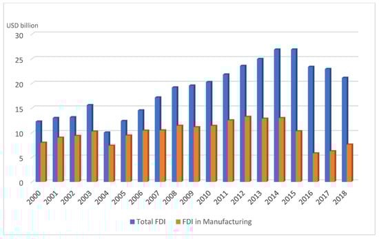 With the highest GDP in China, Guangdong Province has become an expected economic model through 40 years of reform and opening up. The economic development and location of the Guangdong Pearl River Delta has obvious outward-looking characteristics. Foreign investment is essential to contribute to the Guangdong’s economic growth. Blomström and Kokko [9] mentioned that FDI seems more important for the geographical spread of technologies. Wang [15] found Special Economic Zones (SEZs) are instrumental in bringing FDI. Guangdong Province occupies a special position of China’s manufacturing industry. Figure 1 displays a summary of Guangdong’s FDI in the manufacturing industry compared with the total FDI from 2000 to 2018. Overall, there were steady upward trends in total FDI from USD 12.24 billion to USD 26.88 billion from 2000 to 2015 and slightly decreased in the following two years and bounced back to USD 21.11 billion in 2018. The FDI in the manufacturing industry accounted for more than 50% of total FDI and was relatively stable.