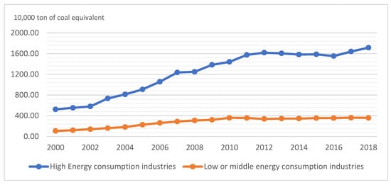 Our data are arranged into two energy consumption panels: high energy consumption and low or middle energy consumption. To explore this data through the two energy consumption panels further, in Figure 2, we present the average energy consumption of two panels. The story that emerges from the figure is that the average using the energy of high energy consumption industries is relatively two to three times more than low or middle energy consumption industries. Based on this scenario, two panels’ regressions were carried out and analyzed.