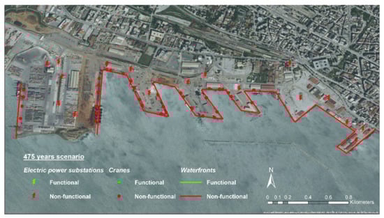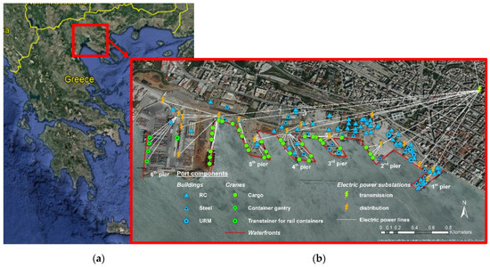 The inventory of port critical components and their dependencies include all waterfront structures, piers, cranes, various buildings, and, in this application example, the electric power supply system. It is based on the existing GIS database for port facilities developed by the Research Unit of Soil Dynamics and Geotechnical Earthquake Engineering (SDGEE, sdgee.civil.auth.gr) at the Aristotle University of Thessaloniki in collaboration with the Thessaloniki Port Authority in the framework of previous research projects. The taxonomy used to define the different typologies is described in Crowley et al. [14]. Figure 2 presents the location of Thessaloniki port in Greece as well as a geographical representation of the port facilities considered in this study. Although not presented in the figure, information on other elements and systems (e.g., utility system, road/rail network, etc.) is also available, allowing their potential exploitation in a future work.