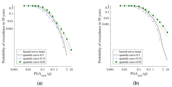 Figure 4 shows the computed mean, median, 15%, and 85% quantile seismic hazard curves for the seismic basement (VS > 800.0 m/s) and for the ground surface. To obtain an idea of the results of the PSHA analysis in the broader area for a specific mean return period, i.e., Tm = 475 years, in Figure 5, we present the spatial distribution of the peak ground acceleration (PGA) for rock conditions and at the ground surface in the whole area of Thessaloniki city for a 10% probability of exceedance in 50 years. At the port area, mean PGA at the ground surface varies from 0.34 g to 0.37 g, without considering the potential of liquefaction in the shallow layers. These values are much different, as we will see in Section 4.2, from the corresponding ones computed using the deterministic scenario-based approach, which, in this example application, is carried out when liquefaction effects are considered. The important differences highlight how significant it is to accurately evaluate seismic hazard when considering site-specific conditions.