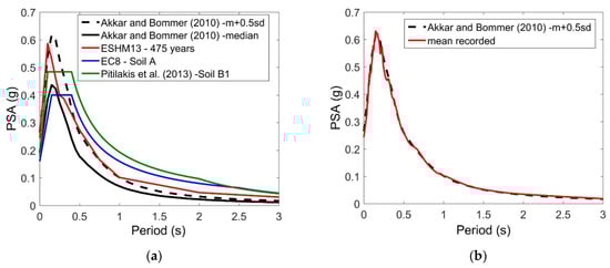 The target spectrum is defined based on the disaggregation of the probabilistic seismic hazard analysis [24], by which the most significant contribution to seismic hazard for the Thessaloniki port is associated with the Anthemountas normal fault system [25,26], regardless of the return period. For this specific fault system, the expected or most likely moment magnitude Mw and epicentral distance Repi to cause the exceedance of a specified PGA value corresponding to Tm = 475 years for the port area were estimated as 5.7 and 15 km, respectively [24]. In addition to magnitude and distance, the hazard scenario should include an error term ε that will be responsible for a sizable share of spectral ordinates. Thus, the median spectral values plus 0.5 standard deviations (σ) were adopted, which are in agreement with the earthquake scenarios selected in Akkar et al. [27] to generically represent the moderate seismicity regions in Europe (median + 0.5σ for a Mw 6 event). Figure 6a shows the spectral ordinates of the 5% damped Akkar and Bommer [19] target spectrum (including the corresponding ε term) in comparison with the uniform hazard spectra found in the literature.