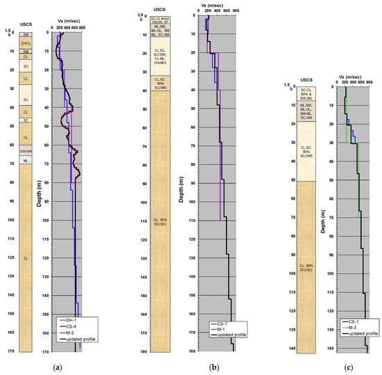 Figure 7. Vs profiles for site 9 ((a) left, (b) middle, and (c) right) together with the Unified Soil Classification System (USCS) USCS characterization.