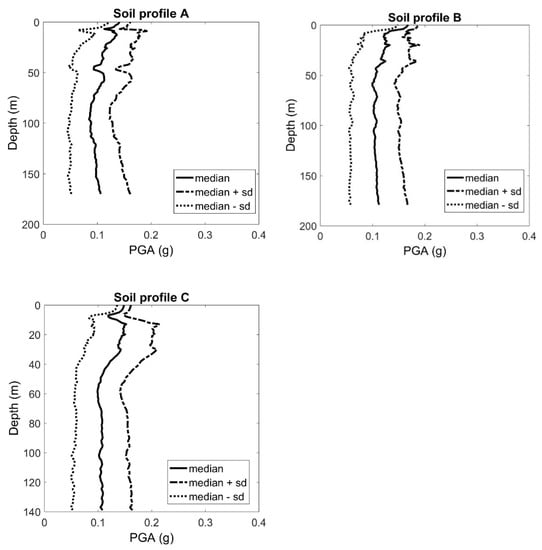 Figure 8. Scenario-based approach: median ± standard deviation variation in PGA values with depth for the three representative soil profiles at the port area.