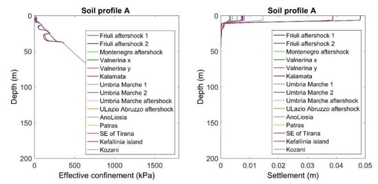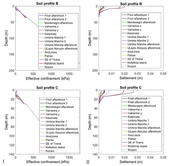 Figure 9. Scenario-based approach: (I) variation in effective confinement and (II) settlement with depth for the 15 selected time histories and the three representative soil profiles.