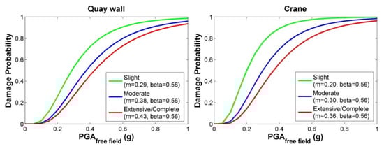 For the probabilistic assessment approach, fragility curves solely due to ground shaking are selected for all port components. Regarding the fragility functions for the gravity quay walls, cranes, and electric power substations considered in this application example, the fragility curves found in the literature are used to assess the damages due to ground shaking which are either case specific [43] or generic [41]. Specifically, as regards the electric power distribution, substations generic fragility functions due to ground shaking based on the HAZUS model [41] are used. For the typical gravity quay walls and the gantry cranes of the port subjected to ground shaking, we use seismic fragility curves that have been developed based on nonlinear dynamic analyses in collaboration with the National Technical University of Athens in the framework of another research project [43]. Figure 10 shows the fragility curves and their parameters (i.e., median m and log-standard deviation beta) for the quay walls and the cranes.