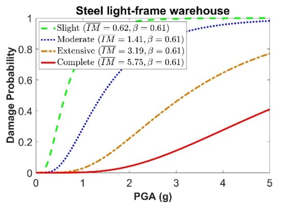 Figure 11. Fragility curves for the steel-light frame warehouse due to ground shaking.