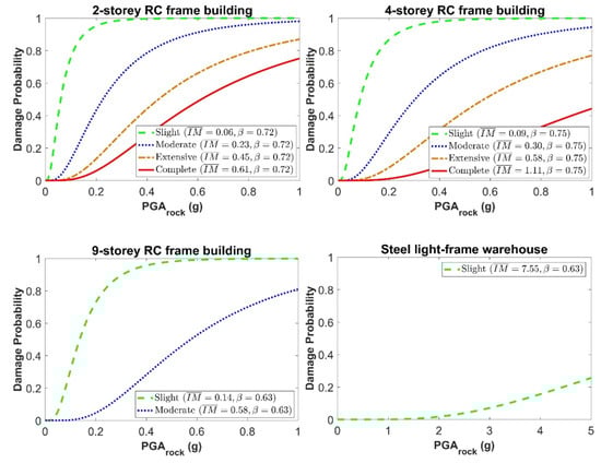 As far as the critical port buildings are concerned, Kappos et al. [44,45] and Karafagka et al.’s [46] fragility curves due to ground shaking are considered for the RC frame buildings and the steel light-frame warehouse, respectively. Figure 11 depicts Karafagka et al.’s [46] fragility curves and their parameters for the steel-light frame warehouse subjected to ground shaking derived from nonlinear incremental dynamic analyses of a specific representative warehouse typology.