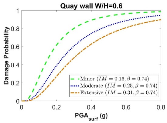 Figure 13. Fragility curves in terms of PGAsurf for the quay wall configuration with a W/H ratio equal to 0.6 due to the combined effects of ground shaking and liquefaction.
