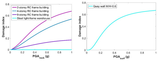 For both probabilistic and scenario-based approaches, following Kappos et al. [45] for the RC buildings and NIBS [41] for the steel warehouses, quay walls, cranes, and electric power substations, the central value of the damage index at each damage limit state is presented in Table 2. A vulnerability curve is then constructed to provide a unique damage index for each level of seismic intensity. Figure 14 presents the developed vulnerability curves for the combined damages due to ground shaking and liquefaction used for the scenario-based approach given as a function of PGArock for the considered critical buildings of the Thessaloniki port, and as a function of PGAsurf for the considered quay wall configuration with a W/H ratio of 0.6.