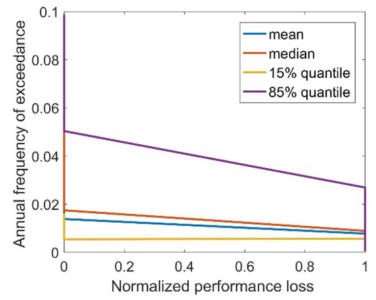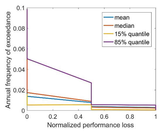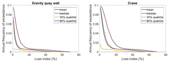 Figure 15 illustrates the mean, median, 15%, and 85% quantile loss exceedance curves for typical gravity quay walls, cranes, and the distribution electric power substations. As shown from these figures, depending on the loss index level (%), a higher annual probability may be computed either for the distribution substations or the cranes. For instance, for a loss index of 15%, the median exceedance annual frequency would be 0.0057, 0.00885, and 0.00585 for the gravity quay walls, cranes, and distribution electric power substations, respectively. For a loss index of 5%, the corresponding median annual probabilities would be higher compared to the previous ones, at 0.0173, 0.04875, and 0.0832 for the gravity quay walls, cranes, and distribution electric power substations, respectively.