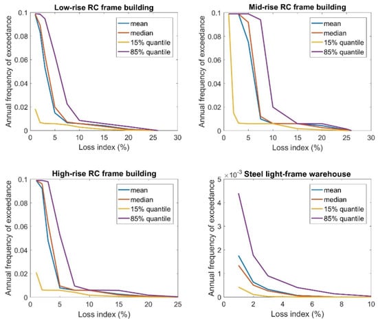 Figure 16 shows the mean, median, 15%, and 85% quantile loss exceedance curves for the port buildings due to ground shaking. Among the RC building typologies, higher annual probabilities of exceeding the given loss index levels (%) are obtained for the mid-rise RC frame buildings compared to the corresponding low- and high-rise buildings. The steel warehouse shows much lower annual frequencies for given loss index levels (%) compared to the RC frame buildings. For example, for a loss index of 5%, the median annual frequencies of exceedance would be 0.0199, 0.0917, 0.0095, and 0.00005 for the low-rise, mid-rise, and high-rise RC buildings and the warehouse, respectively.