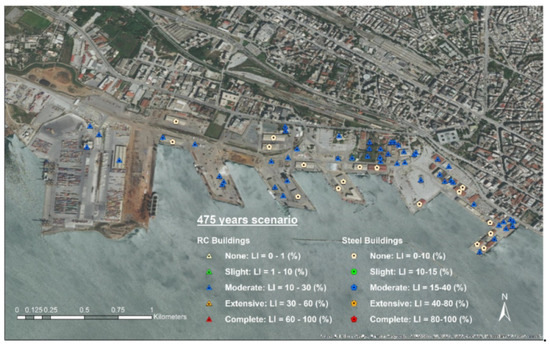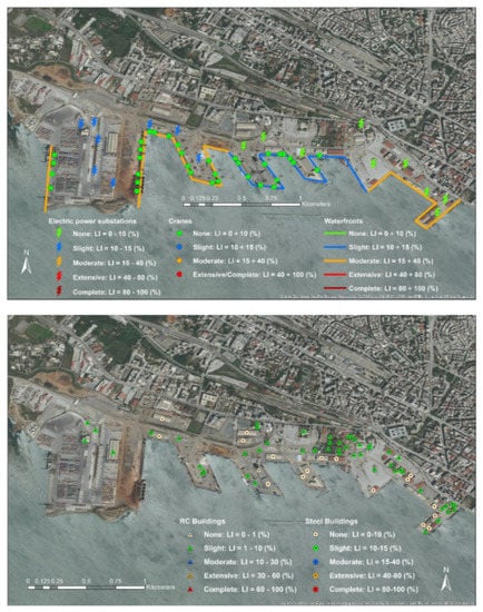 Since the cost of the structural system of a building is less than the cost of a (new) building that also includes non-structural members, the estimated damage indices are then multiplied with an empirical reductive coefficient to obtain the final global damage or Loss Index (LI). For instance, according to Kappos et al. [45], for low, mid, and high-rise residential RC MRF buildings, this coefficient varies from 0.33 to 0.38 while, for steel warehouses, this reductive coefficient is taken to be equal to 0.5 [41]. For the remaining components, namely the quay walls, cranes, and the electric power substations, this coefficient is taken to be equal to 1.0.