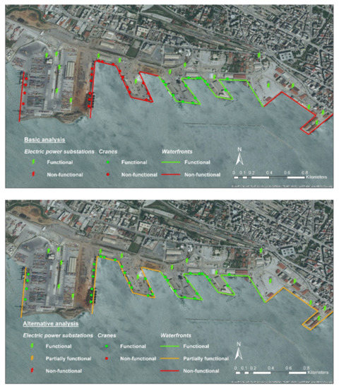 Figure 22. Scenario-based approach: spatial distribution of the port components’ median functionality for the basic (top) and the alternative (bottom) analysis.
