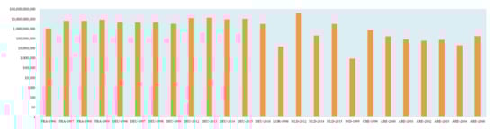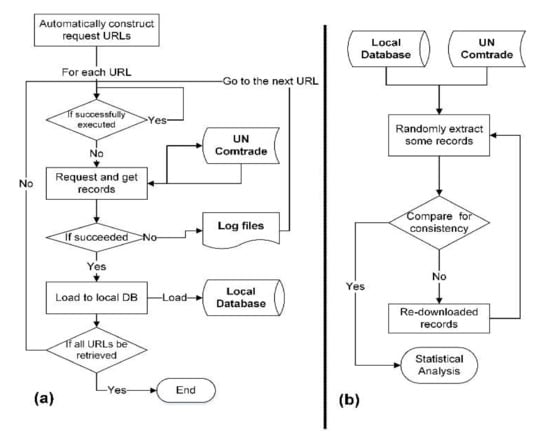 The above process should be executed multiple times until no error URL has been recorded. The development and use of ETL applications have greatly improved the efficiency of data downloading, while avoiding errors that can occur due to duplication and omissions. In addition, one manual strategy was integrated into the data extraction process to check for unexpected data errors (omissions, repetition, and unreadable data) and guarantee the integrity of the data. Using the strategy, multiple records were randomly extracted to compare with the results obtained manually from the UN Comtrade official website. A total of 44,659,097 trade records were filtered as experimental data, including 2,232,953 HS 2-digit-code records, 12,173,521 HS 4-digit-code records, and 30,252,623 HS 6-digit-code records.