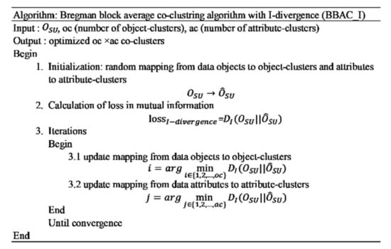 The process is based on the Bregman block average co-clustering algorithm with I-divergence [36]. The process of running the algorithm is shown in Figure 2. First, the co-clustering algorithm randomly maps data objects and attributes to different clusters and generates the co-clustered data matrix as initialization. Then, the differences between the original matrix of statistical imbalance and the newly generated co-clustered matrix are determined according to I-divergence, where represents the I-divergence between and . Next, the algorithm updates the mapping from data objects and attributes to the corresponding clusters through an iterative process, that is, the algorithm assigns different combinations of reporters and years (or reporters, partners, and years) and partners (or commodity codes) to the closest set to minimize the loss until its value reaches a local minimum or falls below a predetermined threshold. Since the global optimal result is difficult to determine, this process may be repeated in multiple initial random mappings to produce the best possible co-clustering result. Finally, the rows and columns of the original matrix are exchanged, putting the rows and columns belonging to the same cluster together to make a reordered data matrix, based on the results of the co-clustering algorithm.