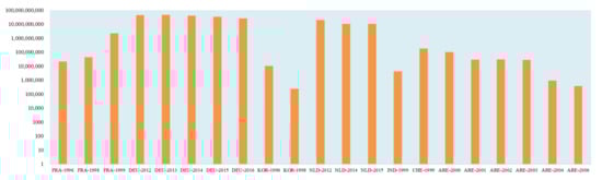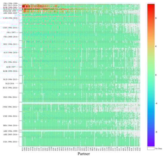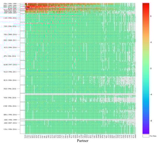 Spatiotemporal judgment matrixes of import imbalances and export imbalances were constructed, as shown in Figure 3, Figure 4, Figure 5 and Figure 6. The missed data (No Data) represents that the reporter country has no trade records with the partner country in a given year, which is out of scope of our study. The statistical imbalance is significantly clustered by reporter. Namely, for a specific combination of reporter and year, their corresponding partners often have similar statistical imbalance characteristics. Severe statistical imbalances are mainly concentrated in a few countries and occur in similar years, including France (1996 and 1998–1999), the Rep. of Korea (1996 and 1998), Germany (1996–1999 and 2012–2016), the Netherlands (2012 and 2014–2015), India (1999), Switzerland (1999), and the United Arab Emirates (2000–2003). However, these cases only cover some of the partners, and their characteristics are inconsistent. Severe export imbalance is more frequent, but the probability of > 10 is higher than that of > 10, indicating that import imbalance has a higher probability of extreme situations. Moreover, import imbalance and export imbalance tend to have a strong correlation, but there are exceptions, such as Germany (1996–1999). In addition, the cases where there are no commodity trade records (that is, no data areas) in both matrixes mainly appear on the right side, corresponding to partners that are small regions or islands, such as HMD (Heard Island and McDonald Islands), SGS (South Georgia and The South Sandwich Islands), and VAT (Holy See (Vatican City State)), which is reasonable. The records data of Vietnam and the United Arab Emirates from 1996–2000 is also missing.