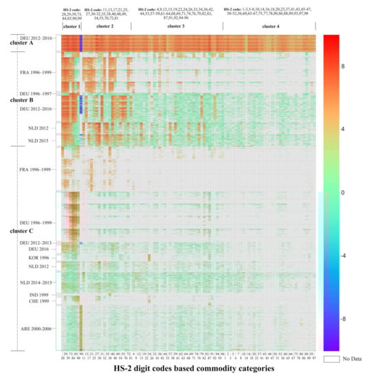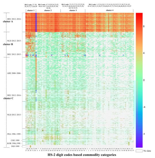 Figure 8 shows that the clustering structure of E-STJM-HS2C is similar to that of I-STJM-HS2C. The statistical imbalance feature distributions of Cluster A of these two judgment matrixes are consistent with each other, and their corresponding reporters are both Germany (2012–2016). There are more commodity categories in Cluster B that show severe statistical imbalance, and the distribution is more clustered (compared to Figure 7). Furthermore, nearly all negative values are gathered in category 99. The results indicate that the statistical imbalance among different reporters, partners, and years shows spatiotemporal variation with differences according to commodity category. For a certain reporter-year group, its statistical imbalance is usually clustered among several commodity categories, except for Germany 2012–2016, where statistical imbalance covers almost all commodity categories.