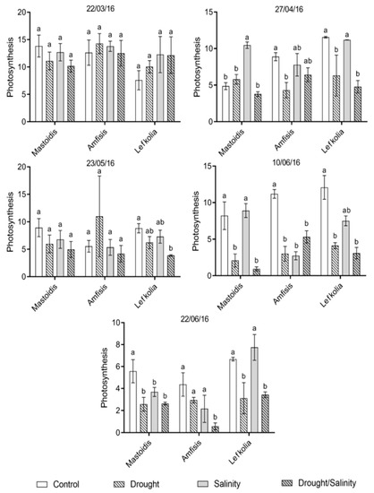 Effects of drought, salinity and their combination on leaf photosynthetic rate of three olive cultivars. In each graph and cultivar, means marked by the same letter were not statistically different. Four replications were used for each cultivar and date. Significance at p < 0.05 (Fisher’s test). Bars are standard errors.