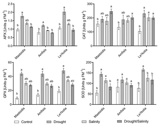 Enzyme activity, presented in Figure 3, revealed significant differences among treatments for all the cases except the SOD enzyme in the ‘Amfisis’ cultivar. In ‘Mastoidis’ and ‘Lefkolia Serron’ plants, both stress factors, when applied alone, resulted in higher superoxide dismutase activity, whereas the activation of SOD under the combination of the two stressors was not so prominent.