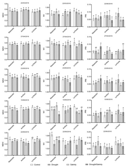 Nevertheless, the ANOVA results for the following dataset (23 May) did not significantly differ in the PRI of different treatments. However, the NDVI of ‘Lefkolia Serron’ appeared to be significantly higher in control plants than in plants exposed to combined salt/water treatment.