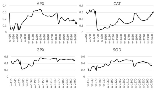 Figure 5 presents a correlation curve of spectral reflectance values with enzyme activity results. As can be seen, GPX appeared to have the highest correlation with the spectrum, followed by SOD. In addition, APX seemed to have a high correlation with spectral reflectance in the range between 1200 and 1900 nm, GPX in the range 1400–1850 nm, CAT in the visible part of the spectrum and SOD around 1350 nm.