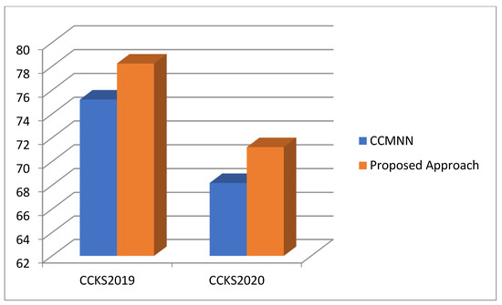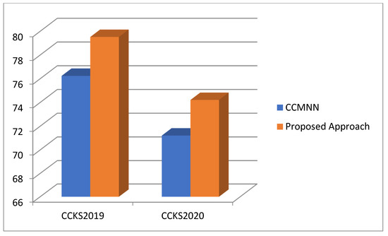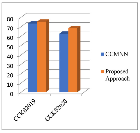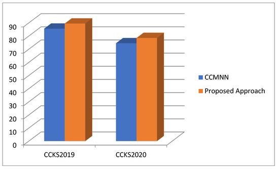 Because no rules are used to preprocess the data, the method in this article has better generalization capabilities; because no external resources and pre-training languages are used in the model, the method in this article requires lower computing resources. To verify the superiority of the standard extraction method proposed in this article, the technique and CCMNN were run on the CCKS2019 and CCKS2020 datasets. The training set was used to train the model, and the model was tested on the corresponding test set; the experimental results are listed in Table 3. For fairness, we did not use the pseudo-data-generation algorithm proposed in this article in the two methods.
