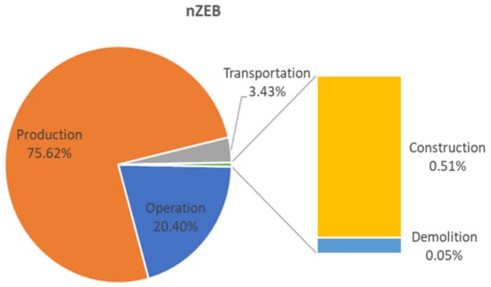 - Paleari, M.; Lavagna, M.; Campioli, A. The assessment of the relevance of building components and life phases for the environmental profile of nearly zero-energy buildings: Life cycle assessment of a multifamily building in Italy. Int. J. Life Cycle Assess. 2016, 21, 1667–1690. [Google Scholar] [CrossRef]