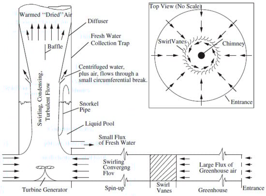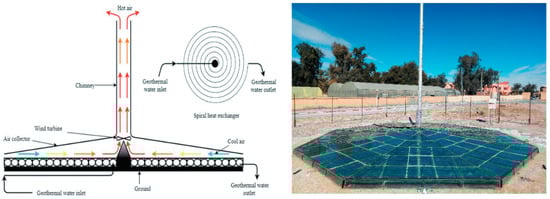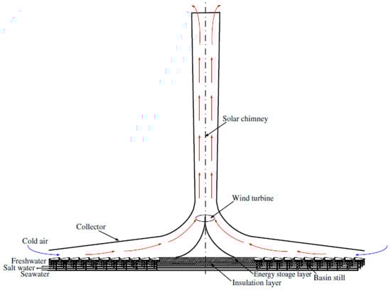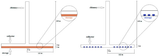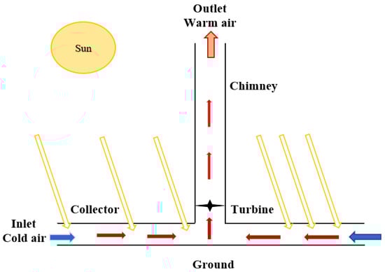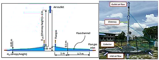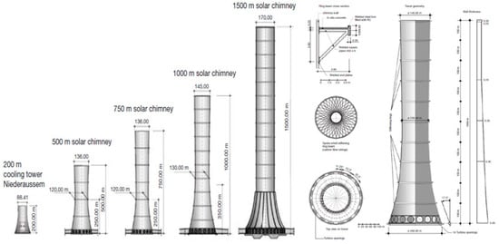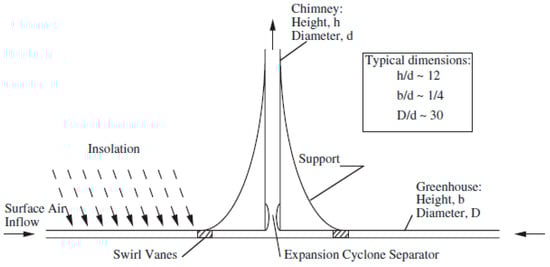 106] analyzed the effect of the chimney height on the system’s output by studying the Manzanares pilot plant. They showed that an increase in the chimney height increases the power output, efficiency, mass flow rate and pressure difference, and reduces the collector’s temperature increase. The change in the range of 100–500 m of the chimney height with 1000 W/m