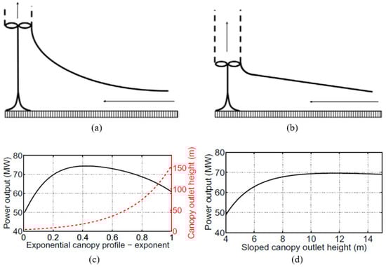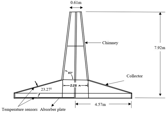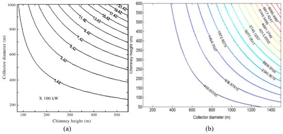 Figure 14). They claimed that an SCPP model with a 100 m chimney height would deliver 0.25 MW of power with a 150 m radius collector at 1000 W/m