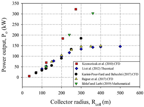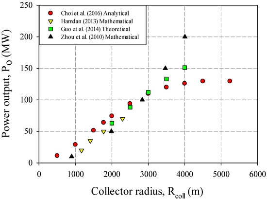 Figure 17 by taking the researchers’ Manzanares pilot plant’s measurements as a reference. The comparison of the studies in which some researchers analyzed the effect of the collector radius in different geometries and climate conditions for the system with a chimney of 1000-m height is given in