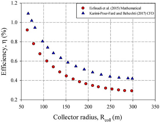 87] analyzed the Manzanares prototype with a 3D numerical study. They showed that with a collector radius of 120 m in the reference geometry, the driving force is 167 Pa. The efficiency of the system is 0.715%. If the collector radius is 200 m, the driving force will be 272 Pa, and the efficiency will be 0.751%. Kalantar and Zare [
