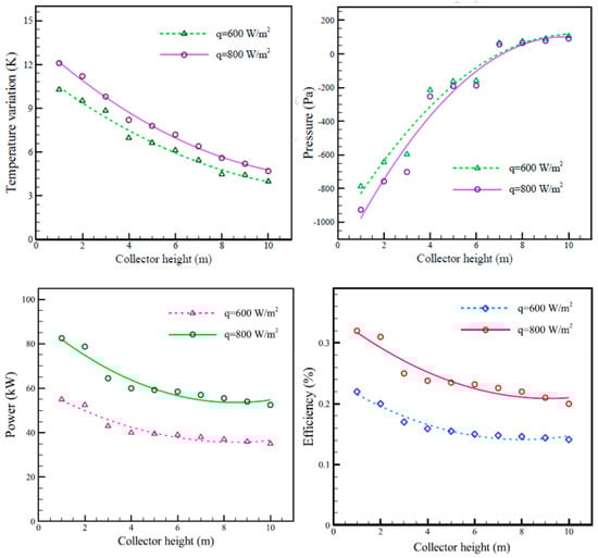 2 radiation values show that increasing the collector height decreases the power output, efficiency, pressure, and temperature change the system. They stated that in 800 W/m