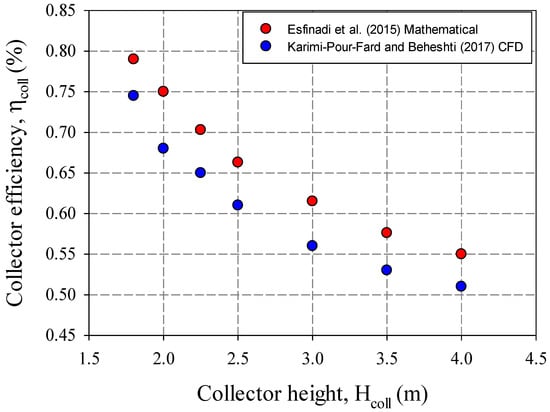 The collector is where both solar radiation and air enter the system. The change in the collector height is an essential geometric parameter determining SCPP systems’ performance. It affects the design’s airflow and the solar radiation transmitted to the ground. Najmi et al. [
