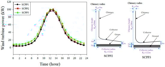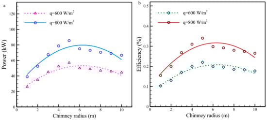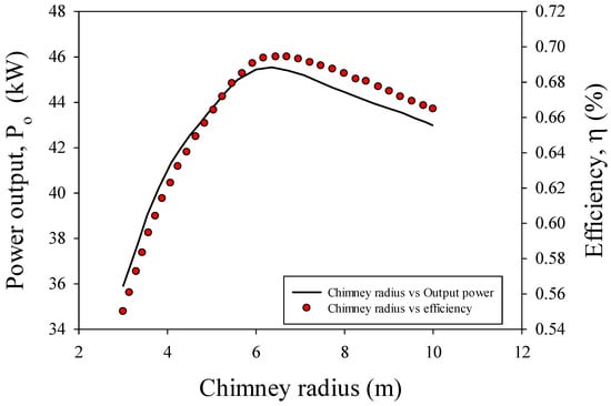 34] developed an analytical model to analyze the effect of geometric parameters and energy storage units on SCPP systems’ performance. The effect of the collector radius change on an SCPP system’s power output with a 1000-m high, 200-m diameter chimney and a 5-m collector entrance height on 1000 W/m