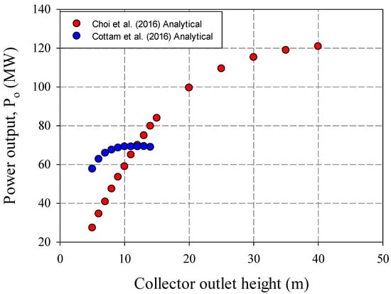 2 radiation intensity, 600-m collector diameter, 250-m chimney height, and 300 K ambient temperature. They claimed that with a chimney height of 483 m, the power output would increase by 116.95% to 742 kW under the same conditions. They showed the increase in power output for different chimney heights and different collector diameters (