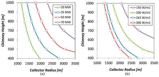 80] shows that the chimney’s height directly increases the power output in a constant radiation intensity. The 35 MW, constant power output shows the relationship between the collector radius and the chimney height in different radiation intensities in
