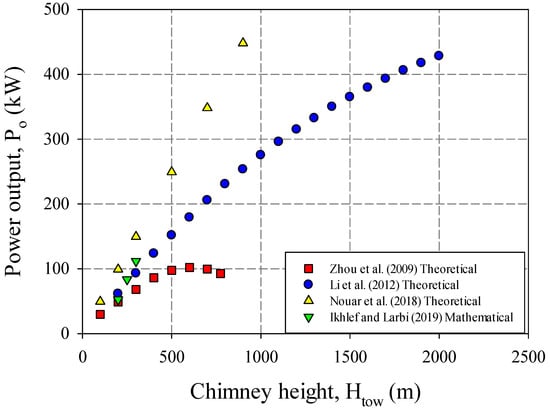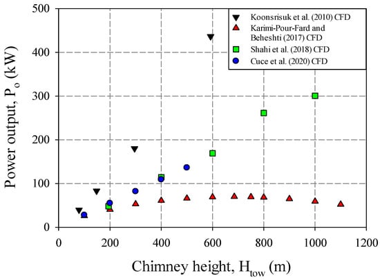 2 and an ambient temperature of 303 K. They claimed that if the chimney height of the system was set to 800 m, the power output would increase by 179.8% to 16.26 MW. Similarly,