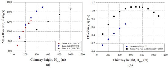 Figure 26. The study results of different researchers regarding the effect of the chimney height on the system’s mass flow and efficiency are presented in