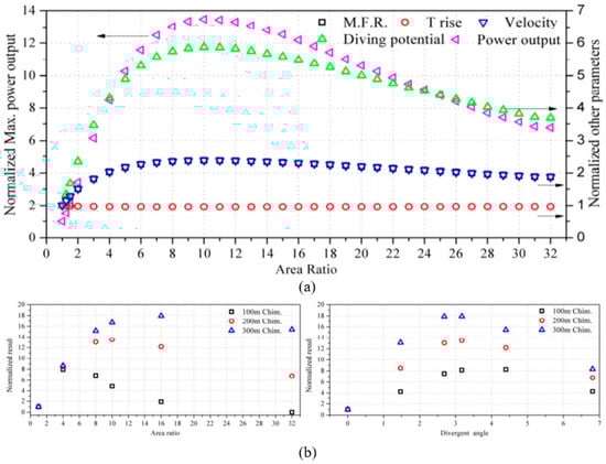 109] developed a CFD model and analyzed the effect of the change in the chimney exit area ratio to the chimney entrance area on solar chimneys’ performance. They explored the system’s effect on the airflow rate, temperature increase, diving potential, and power output by changing the chimney exit area between 1 and 32 times, taking the Manzanares pilot facility’s geometric dimensions as a reference, with the chimney entrance being constant. They claimed that an ideal value for the chimney exit area’s ratio (AR) to the chimney entrance area for the pilot plant was about 10. They claimed that the performance of the system at this value was the maximum. Similarly, for 100-m, 200-m and 300-m chimney heights, they provided a normalized result comparing the AR and the divergent flue angle. They emphasized that increasing the AR after this point, where it is the current peak in every situation, would have a negative effect on the system.