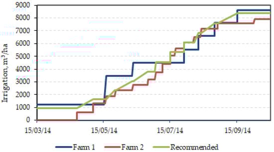 Integral irrigation applications in Farm 1 and Farm 2 as well as based on recommendation. Modified from Abdurakhmanov et al. (2019) [40]. Data of the recommended irrigation schedule (green line) is adapted from Domullodjonov (1988) [43].