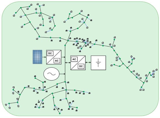 The hybrid mini-grid shown in Figure 1 was modeled and used in a previous publication related to this research study [9], which was developed as a composite of those systems designed and installed by practitioners and based on the mini-grid design methods available in the literature. The mini-grid network was modeled using the open distribution system simulator (OpenDSS)/MATLAB software (R2021a) [23].