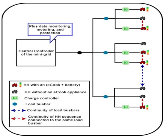 To understand the charging/discharging behavior of eCook batteries, the technical impact on the grid and their advantages, the batteries were allocated to 47 HHs (≈43% of total HHs) connected to the mini-grid network (starting with those connected HHs furthest from the power station). To explore most of the generated daily PV output power needs, a 10 kW PV-inverter (adequate to accommodate the network baseload) was replaced with one of 25 kW, and the size of the centralized battery used in the previous study [9] was reduced from 41.4 kWh to 27.6 kWh. Hence, the mini-grid network studied in this paper includes a 30 kWP PV, 25 kW PV-inverter, 27.6 kWh centralized battery, and 8 kW converter. In terms of the distribution and service cables, the CSA is set to 50 mm2 and 16 mm2, respectively. As can be seen in Figure 1, the shaded HHs have batteries available to support their cooking.
